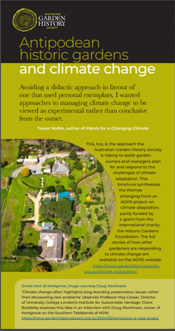 Gardening in a changing climate requires experimentation and flexibility. Learning how others have responded to more dry spells and unseasonable wet periods can help, as can planning ahead to futureproof a garden. That’s the rationale underlying a project the Australian Garden History Society initiated with a grant from the international charity, the Historic Gardens Foundation. AGHS gathered a variety of perspectives to help garden owners and managers plan for and respond to the challenges of climate adaptation. These can be found on the climate adaptation pages of this website. The main ideas are also synthesised in a brochure that you can find here. Read about the AGHS’s framework for action on climate change, find out about where you can get good advice on reducing the carbon footprint, climate sensitive design, smart water and soil management and plant selection or go to the full stories to read about individual’s experiences in their gardens.