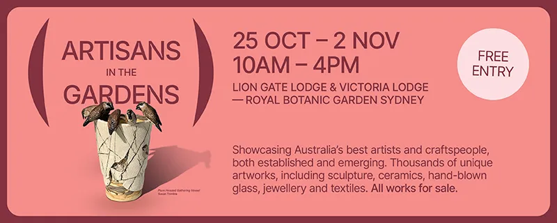 Since its inception in 2000 with just four exhibitors in a small room, this prestigious exhibition has grown into a sophisticated event, now showcasing a diverse range of over 3,000 pieces across multiple mediums. For the first time, Artisans in the Gardens will span across two venues, Lion Gate Lodge and Victoria Lodge in the Royal Botanic Gardens.