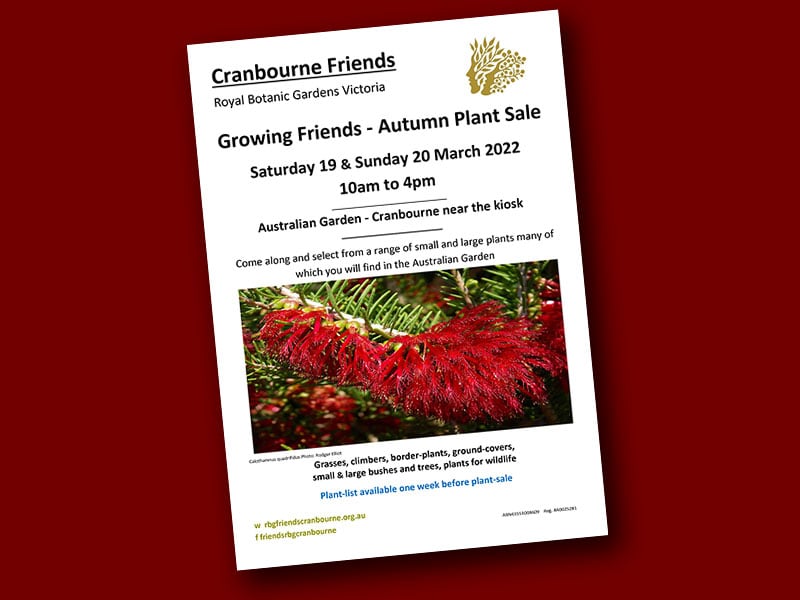 Cranbourne Friends of the Royal Botanic Gardens Victoria is holding its annual Autumn Plant Sale in mid March. The plant sale will be held near the Kiosk at the northern end of the Australian Garden at Cranbourne in Victoria.