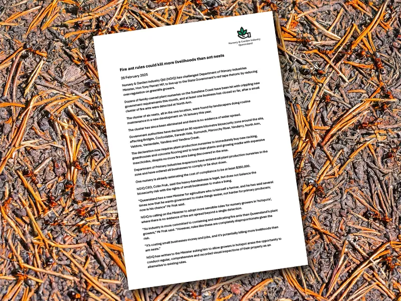 NGIQ is calling on the Minister to adopt more sensible rules for nursery growers in ‘hotspots’, where there is no evidence of fire ant spread beyond a single detection.