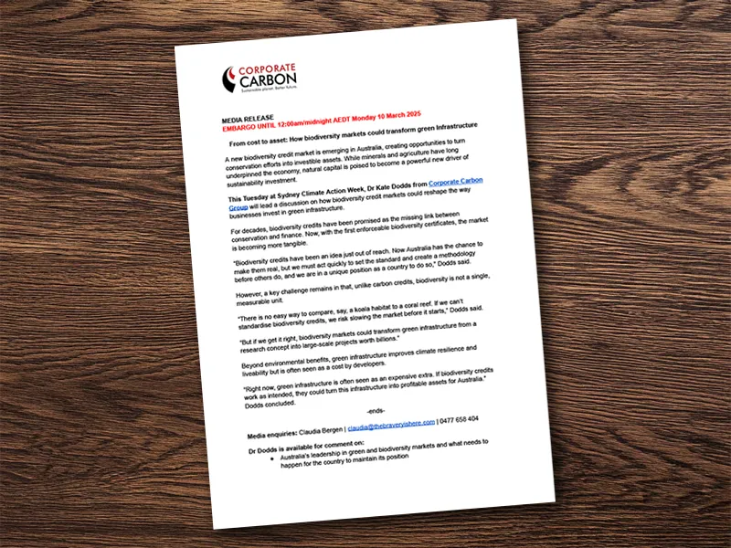 This Tuesday at Sydney Climate Action Week, Dr Kate Dodds from Corporate Carbon Group will lead a discussion on how biodiversity credit markets could reshape the way businesses invest in green infrastructure.