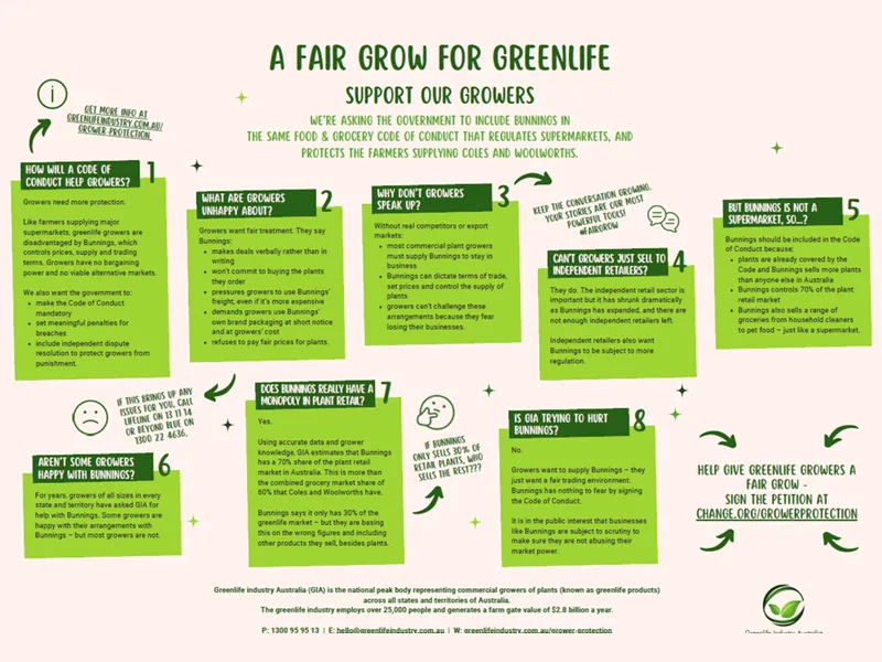 - ABC’s Country Hour: www.abc.net.au/listen/programs/nt-country-hour/bunnings-concerns-rasied-by-greenlife-industry-australia/103583256