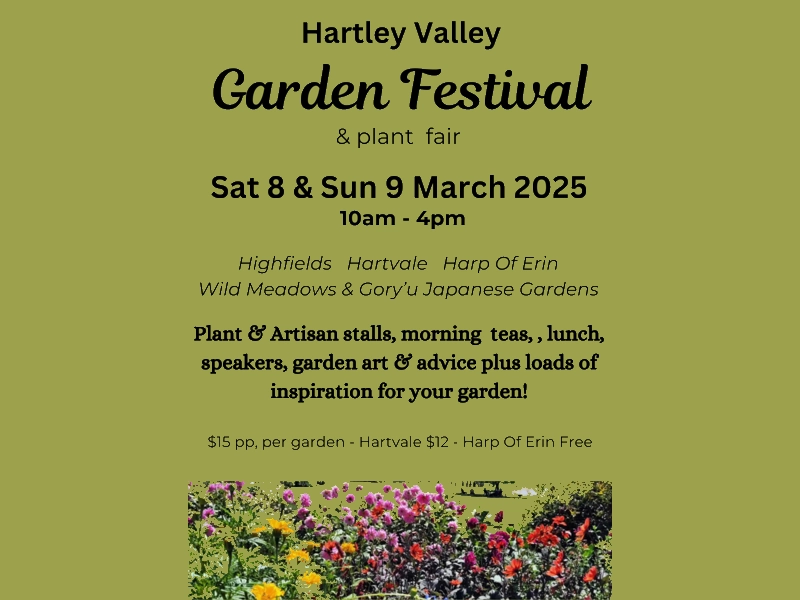 The Hartley Valley Garden Festival and Plant Fair takes place on the 8th and 9th of March this year with five gorgeous gardens to visit all located in the beautiful Hartley Valley. Highfields, Hartvale, Wild Meadows, Harp Of Erin and Gory’u Japanese Gardens. The festival will also feature guest speakers, artisan and plant stalls, sausage sizzles, artwork and delicious morning and afternoon teas.