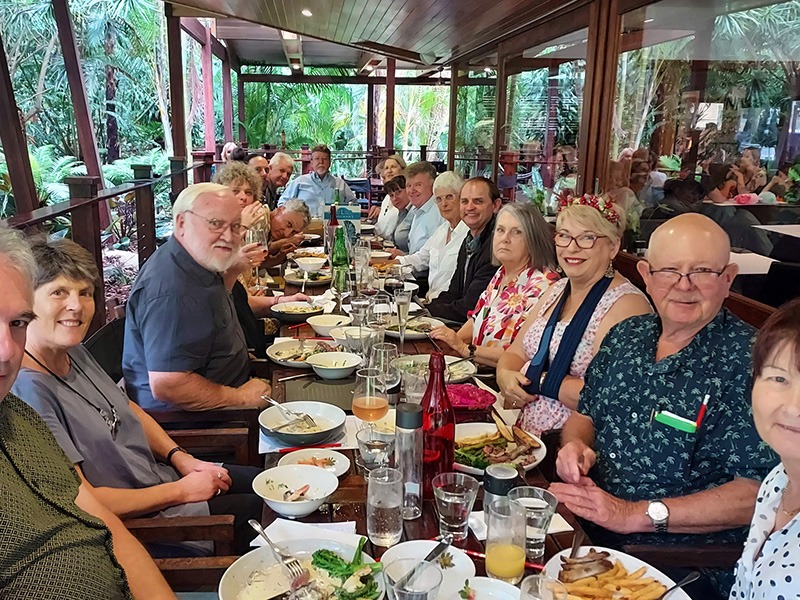 The venue was Daisy’s Place/That Pizza Guy HQ, 2859 Steve Irwin Way, Glenview, Queensland. A dense rainforest provided an appropriate backdrop to the long table set out under the covered deck. Several convivial hours were spent enjoying a shared starter platter and a choice of several mains options and two desserts. Guests included Marion and John Beazley from the Queensland Garden Expo.