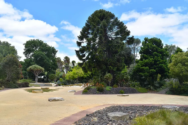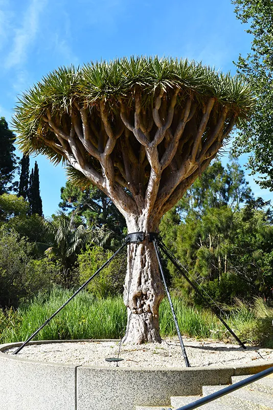 “You can walk right or left, but before you do, look straight ahead to see the dramatic sand bowl setting off the dragon tree (supported by stakes) with the towering bunya pine and striking cacti on the right. The dragon tree (Dracaena draco) was planted by the first curator Daniel Bunce in the 1850s and moved from outside the Garden gates to the current site.”
