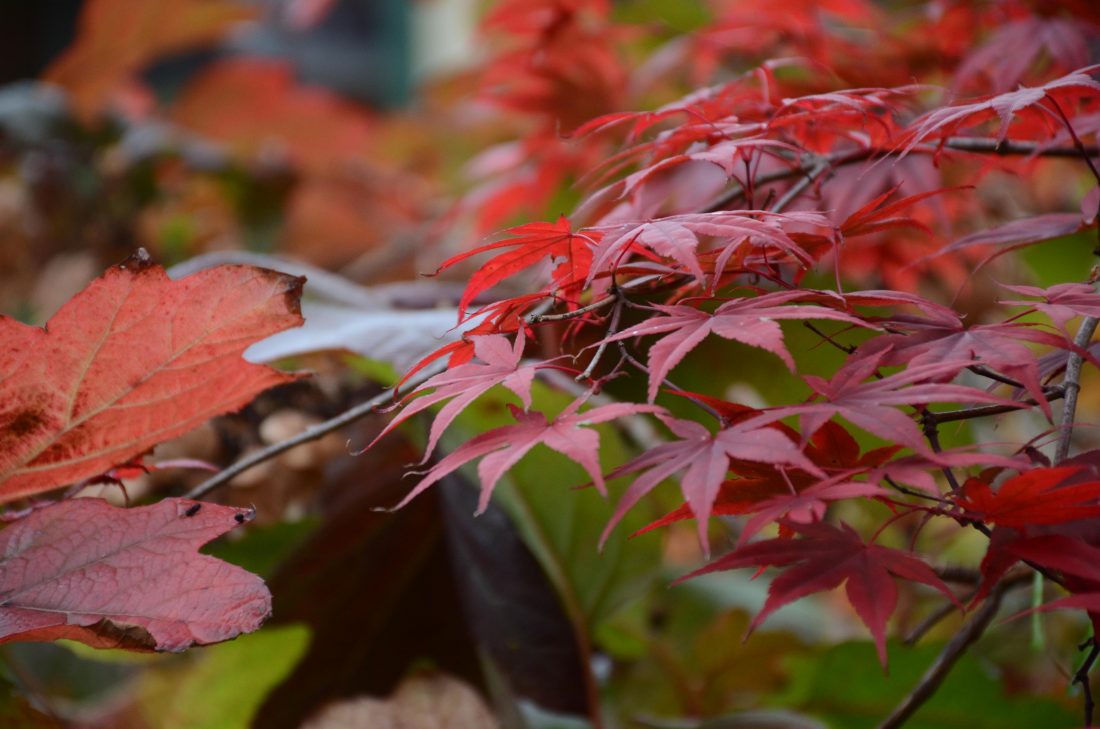 Description: I love the way the dainty leaves of the Japanese maple seem to be stretching out towards the larger, more robust oak-leaf hyrangea almost a botanical take on Michelangelo’s Creation painting.