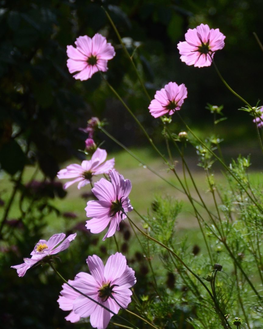 Description: These cosmos are all facing the sun and look a bit like curious kids. Puts me in mind of the proverb that a cat may look at a king.
