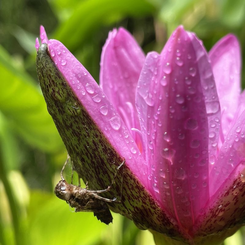 Description: We're often so taken by beauty that we overlook the inadvertent function of flowers and plants. In this near-macro shot a water lily slowly opens and beneath is the shell of dragonfly nymph. It has emerged from the pond depths to use this gorgeous flower as its launch-pad to the sky. Note that this was shot on iPhone 12 Pro equivalent ISO 32, 4.2mm, f1.6, 1/882.
