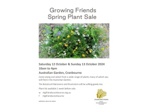 Cranbourne Friends Royal Botanic Gardens Victoria’s Spring Plant Sale is a regular event on the gardening calendar. The next spring plant sale will be held at the northern end of the Australian Garden at Cranbourne. Parking and entry is available nearby (look for the large red banners). A large variety of Australian native plants will be available. Look for the plant list on the CFRBGV website approximately a week before the sale. EFTPOS is available. The Botanical Fabricators and Illustrators will be selling goods also.