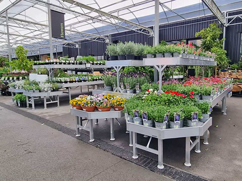 • Plastic-covered roofed area for outdoor plants with steel modular tiered displays.