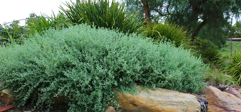 With similar silver-blue foliage to Aussie Hedge Bush™ Rhagodia, this salt bush has a more prostrate habit, perfect for groundcover and low hedging. Like its closely related shrubby counterpart, this low grower shares similar frost, humidity, drought and salt tolerance. 30-50cm high x 1m wide.