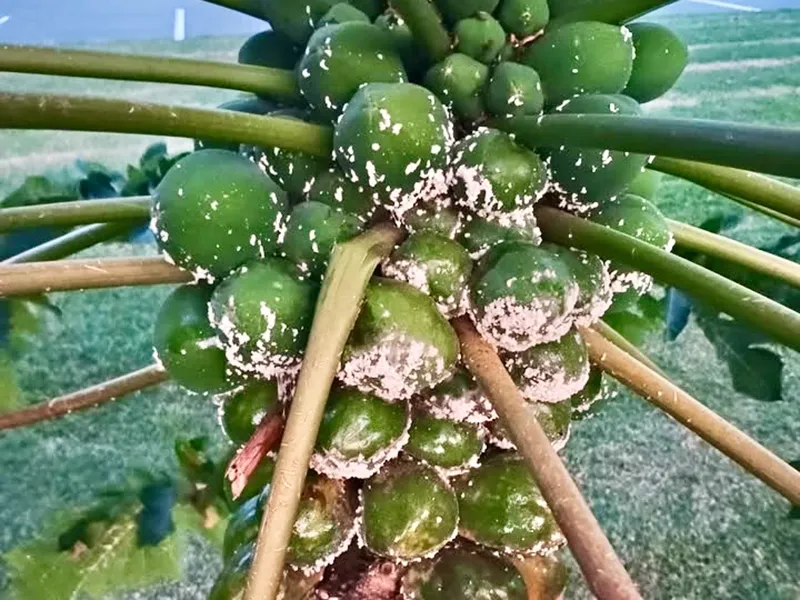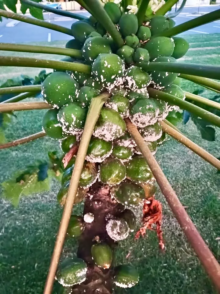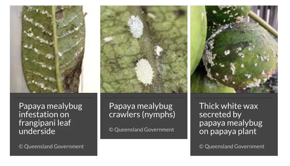 Papaya mealybug (Paracoccus marginatus) is 2-3.5mm long, and bulky for a species of mealybug. It has a yellow body covered with white wax and a fringe of filaments. The eggs are yellow and laid in an egg sac. It is native to Central America and was first detected in Australia in Darwin in July 2023.