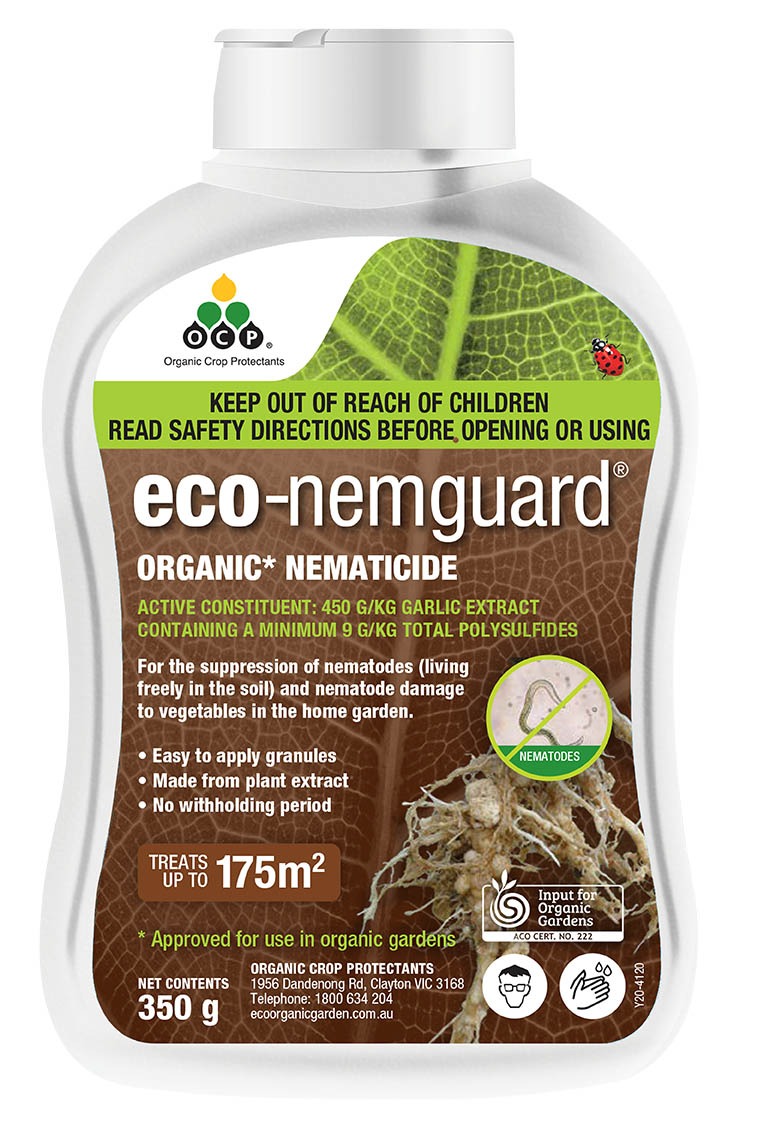 OCP eco-nemguard is a granular product infused with a garlic extract containing polysulfides. Once mixed into the soil the granules begin releasing the polysulfides which kill nematodes living freely in the soil ie before they’ve infected plant roots.