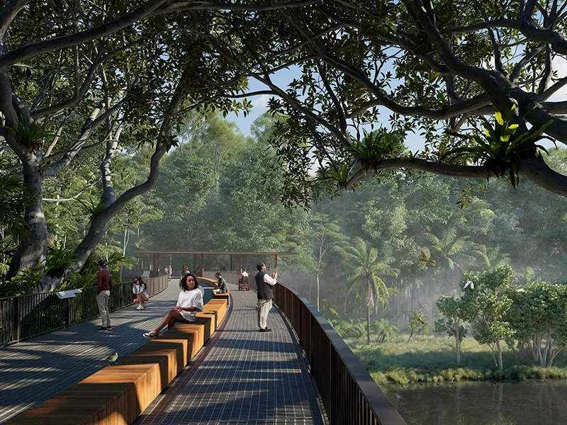 Master plan highlights for our community include walking trails, wetlands, a forest lookout tower, treetop boardwalks, events space, a community hub with a café and facilities for research and operations.