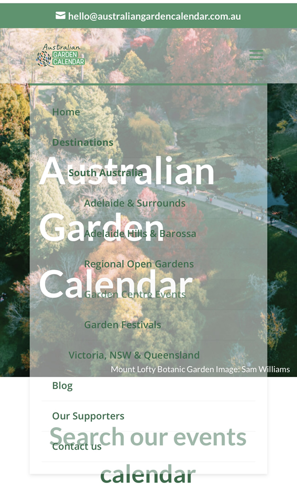 Content is constantly being gathered for the website, which includes events and experiences, destinations, Open Gardens SA, garden clubs and associations plus special interest groups. All are hyperlinked to the relevant website for further information and, if necessary, bookings. Listings include garden festivals, garden centre events, and activities in Queensland, New South Wales, and Victoria.