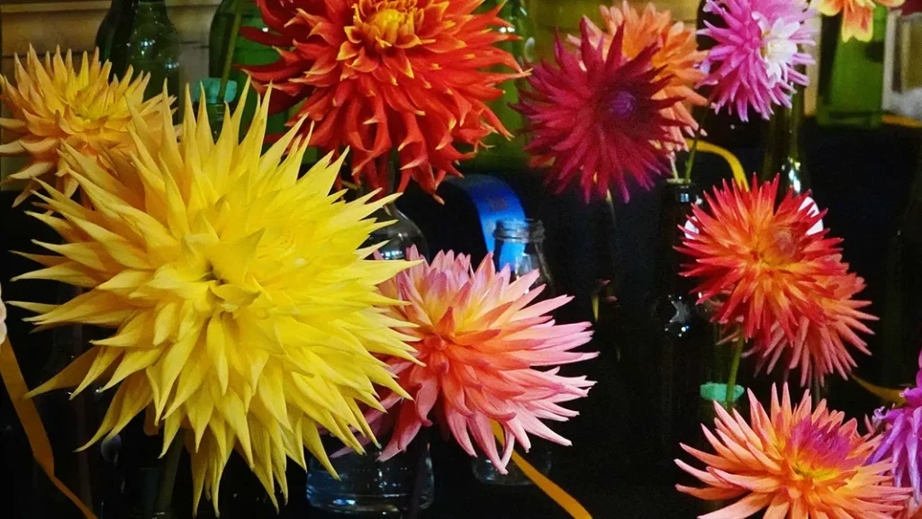 It is exciting to see the show take shape as exhibits arrive in ones and twos and then in box loads: huge dahlias, fragrant roses, special perennials with delicate blooms, a prized maidenhair fern, and lavish flower arrangements. Most of the single flower exhibits are displayed in green glass bottles, which allow individual blooms to star and help unify the show.