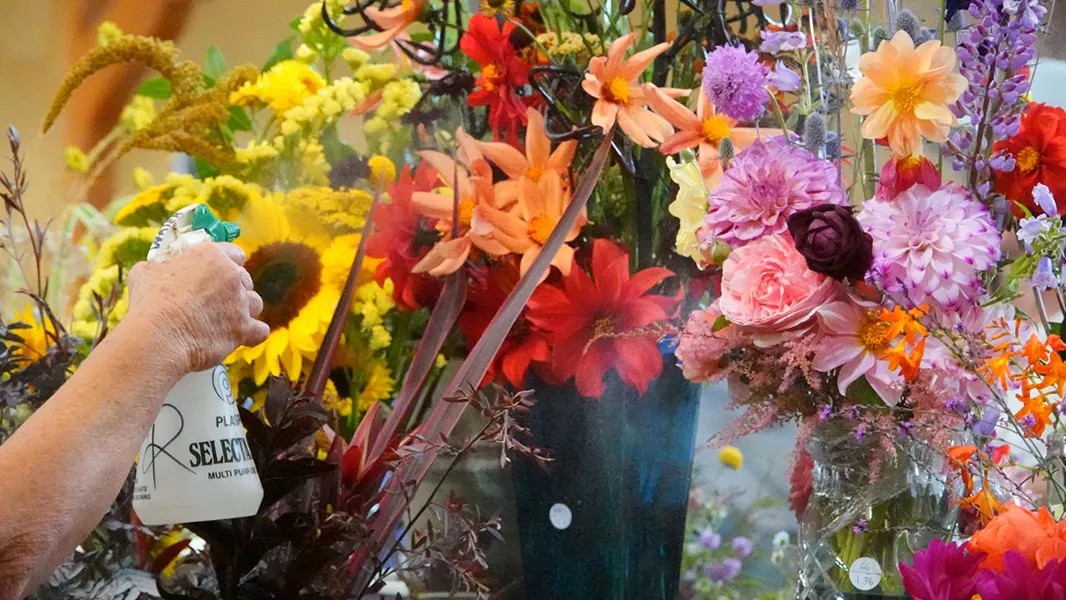 It is exciting to see the show take shape as exhibits arrive in ones and twos and then in box loads: huge dahlias, fragrant roses, special perennials with delicate blooms, a prized maidenhair fern, and lavish flower arrangements. Most of the single flower exhibits are displayed in green glass bottles, which allow individual blooms to star and help unify the show.