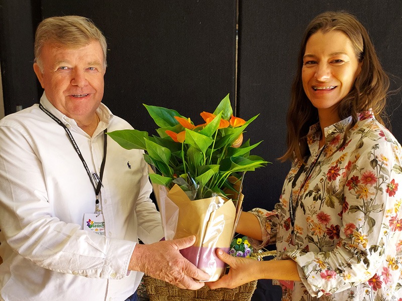 David Furness presents new member, Sarah Heath, with a welcome gift of a potted anthurium.