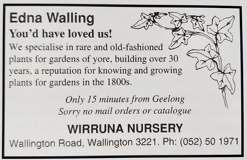 ‘EDNA WALLING you’d have loved us! We specialise in rare and old-fashioned plants for gardens of yore, building over thirty years, a reputation of knowing and growing plants for gardens in the 1800’s.’