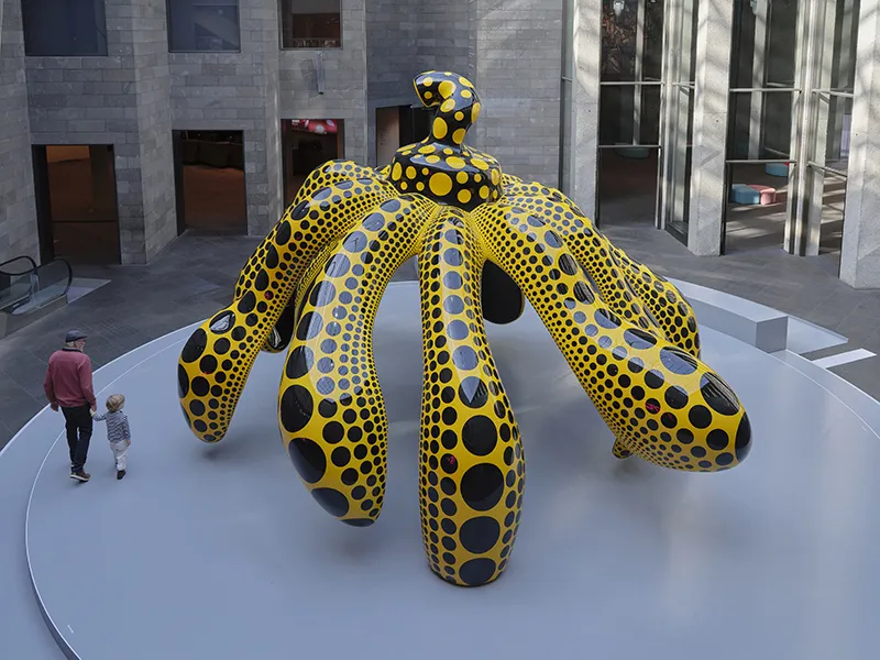 Dancing Pumpkin is one of Kusama’s largest and most ambitious imaginings of the pumpkin to date. Taking her iconic motif into new conceptual terrain, the larger-than-life legs appear to twist and hover in the air, suggesting joyous movement. At NGV International, visitors can go underneath the sculpture and experience Kusama’s beloved pumpkin from a new perspective.