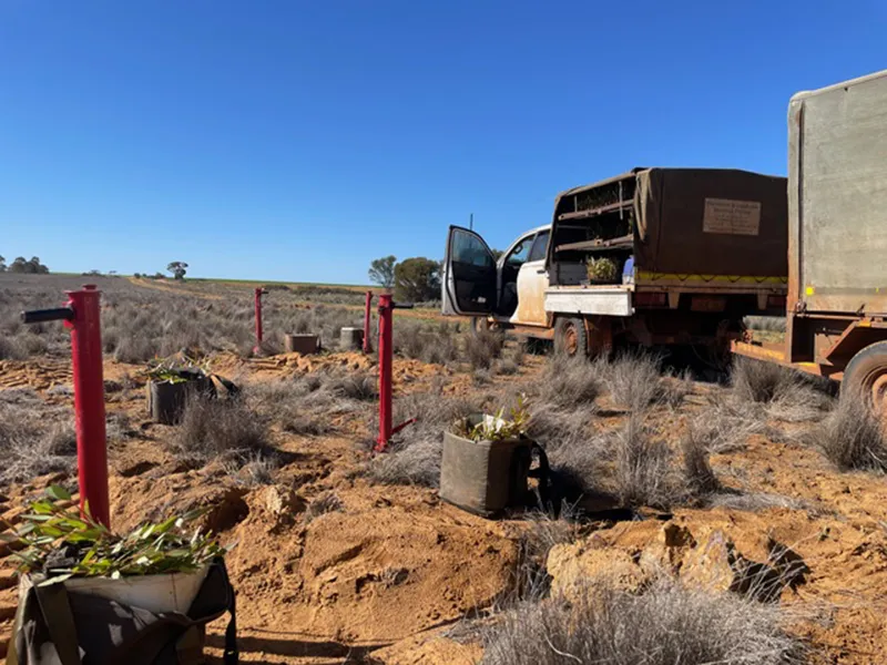 They are currently on a farm about 50km from Binnu in the mid-west, about 1.5 hours inland from the coastal city of Geraldton but are heading to a farm near Yuna shortly and will plant about 1.5 million trees on the two properties over a two-month period.
